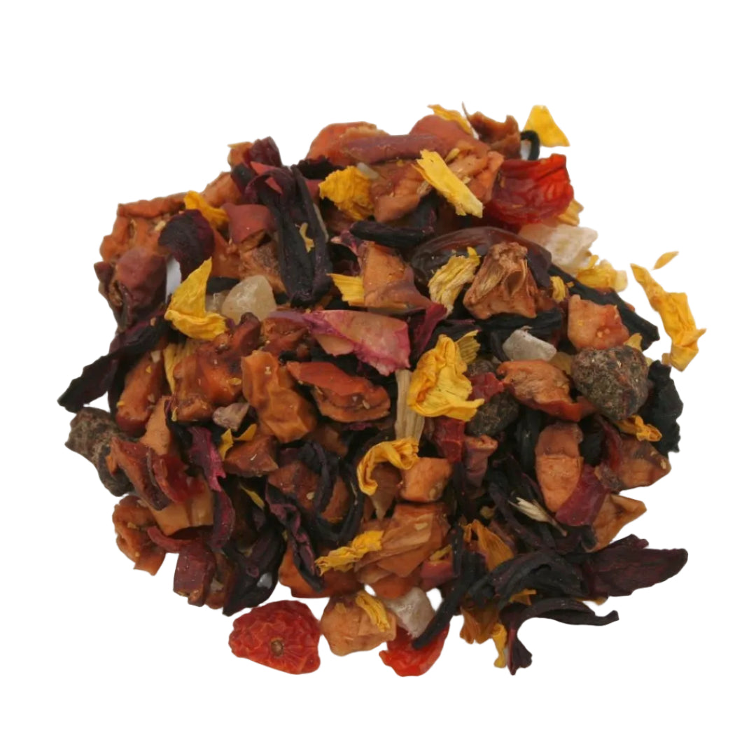 Apfelstücke, Hibiskusblüten, Hagebuttenschalen, Weinbeeren, Ringelblumenblüten, Ananasstücke (gezuckert), Papayastücke (gezuckert), Aprikosenstücke (Aprikosen,Reismehl), Pfirsichstücke (Pfirsich,Reismehl), Aroma.